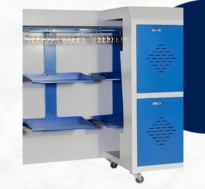 This conveyor tunnel carry belt on vertical clips hanged for drying ink to avoid spilling on the finished leather. Trays option are made for bag, drying unit after inking.